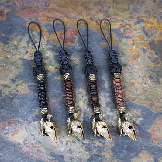 Paracord Knife Lanyard With Antique Brass Spartan Warrior Helmet Bead / Leather Wrap